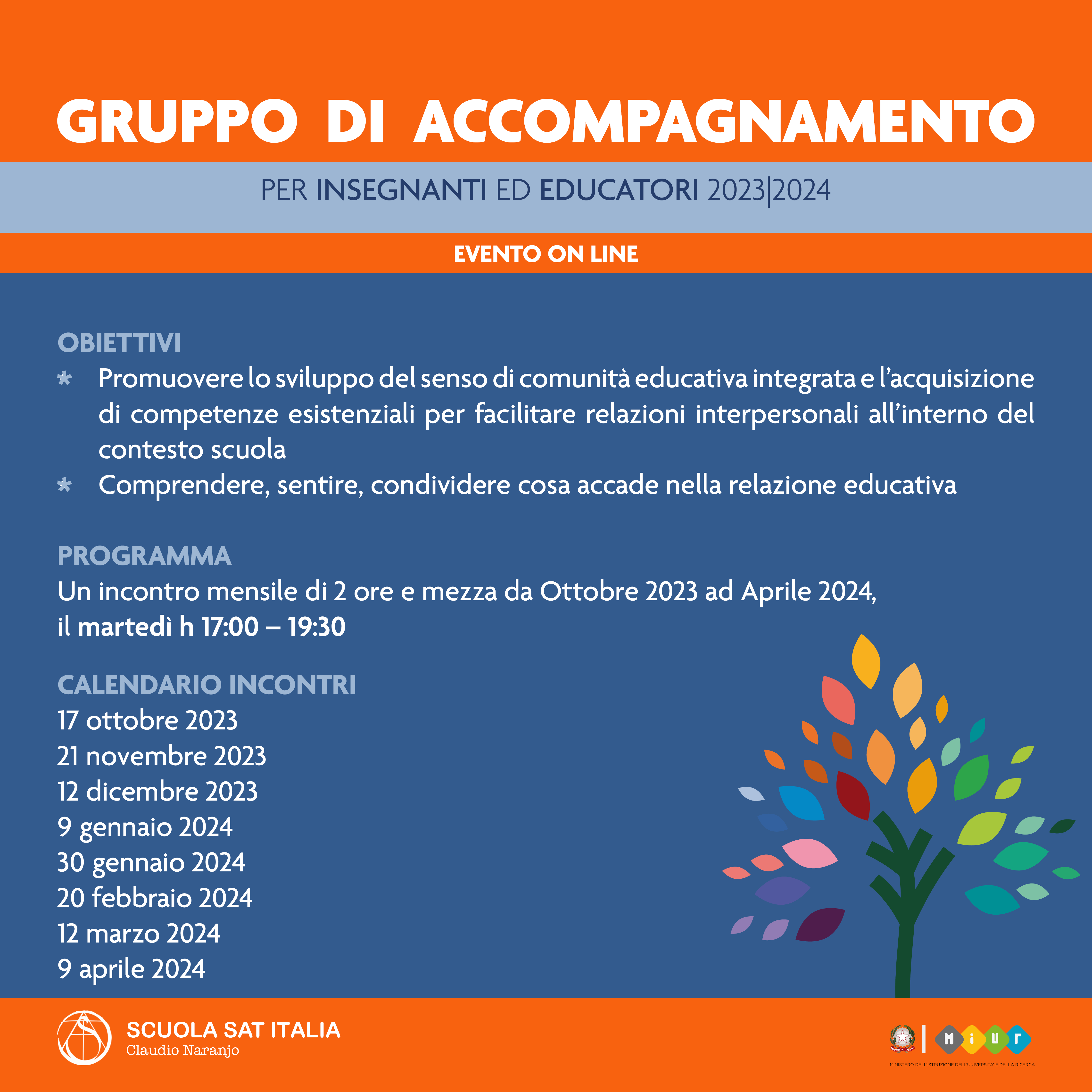 La Scuola SAT Claudio Naranjo è accreditata presso il Ministero dell’Istruzione, dell’Università e della Ricerca per la formazione del personale della scuola ai sensi della Direttiva 170/2016. L’accreditamento dà diritto all’esonero dal servizio del personale della scuola che partecipi alle iniziative di formazione, nei limiti previsti dalla normativa vigente.